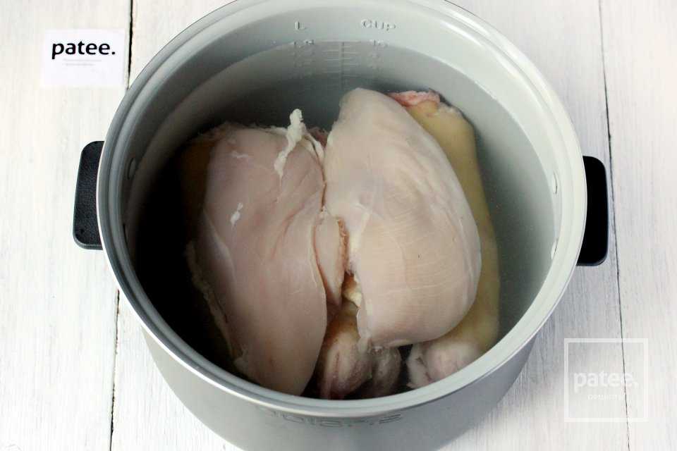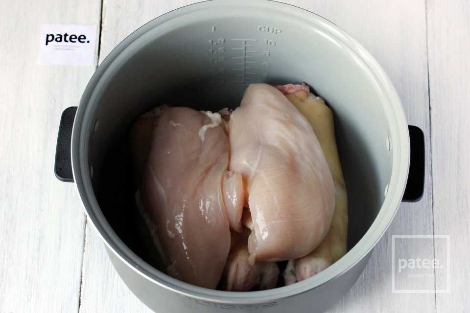 - Птица промывается (удобно брать сразу целую тушку) и помещается в емкость «умной кастрюли».