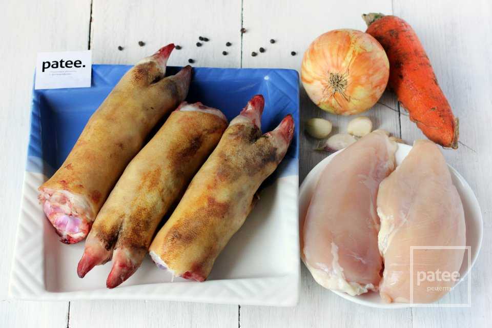 Для приготовления холодца из свиных ножек в мультиварке по этому рецепту нам понадобятся свиные ножки, куриное филе, морковь, лук репчатый, чеснок, соль, чёрный перец горошком, вода.