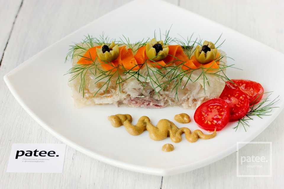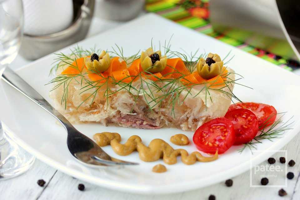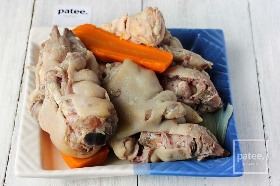 В традиционное блюдо не принято добавлять готовый желатин, а чтоб бульон как следует застыл, необходимо положить в него те части туши, которые обладают желирующим эффектом