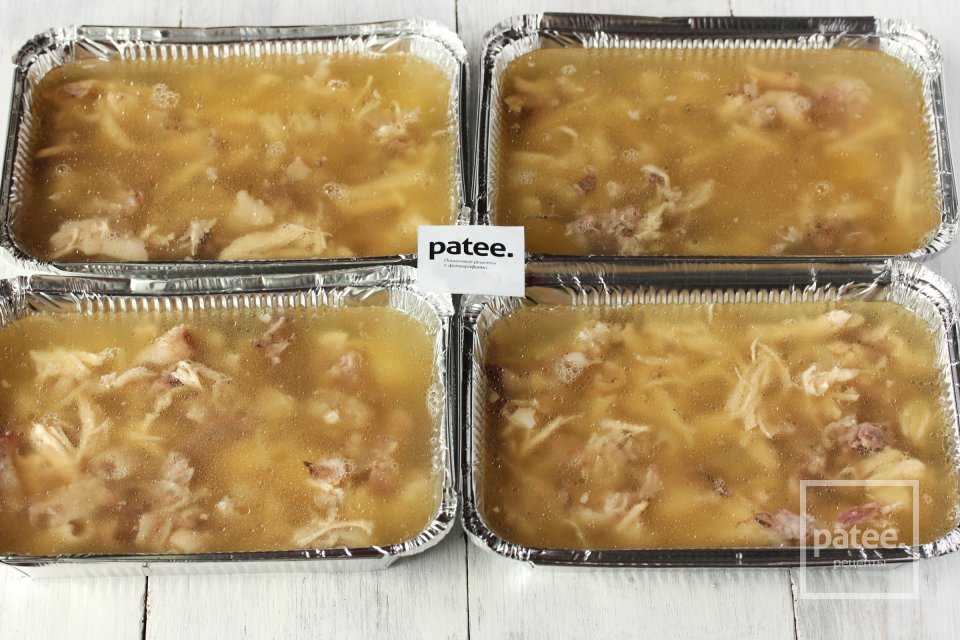 Заливаем мясо бульоном. Оставляем холодец в комнате до полного остывания, а после ставим в холодильник минимум на 6 часов.