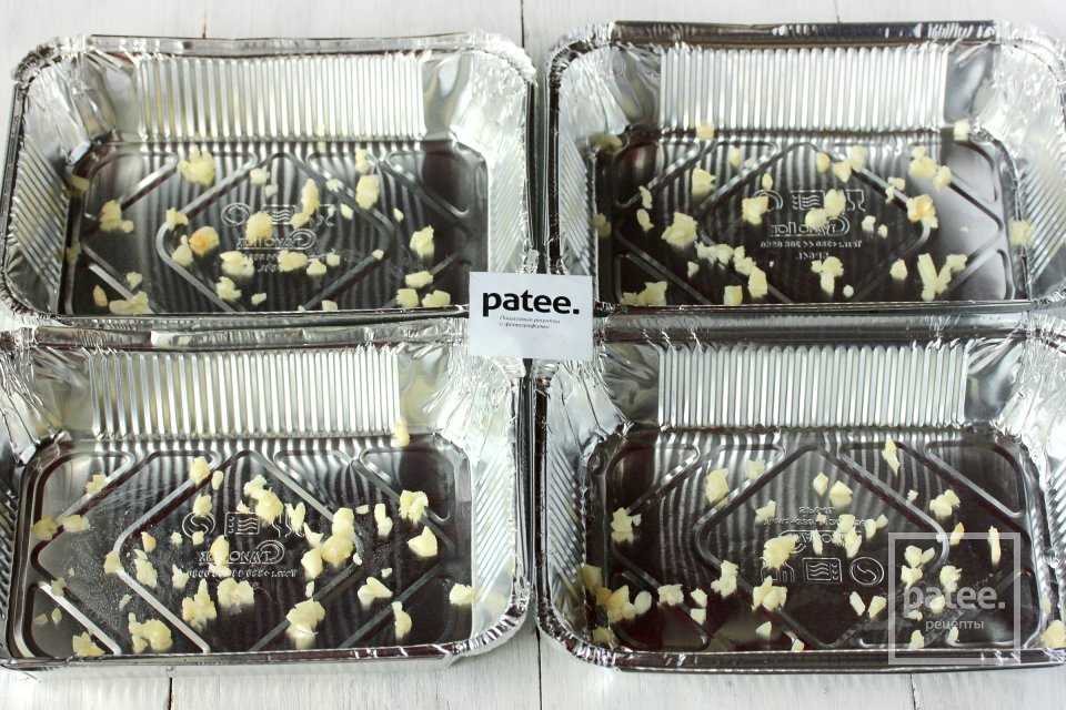В ёмкости для холодца выкладываем чеснок, распределяем по дну. Из данного количества ингредиентов получилось 4 контейнера (судочка или лотка) объёмом 1 литр каждый.