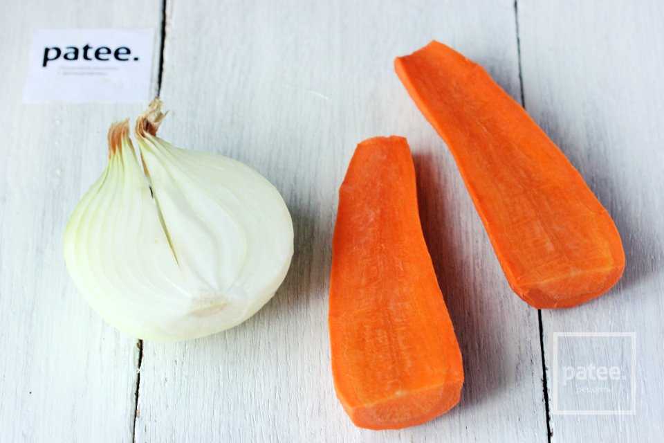 Пока холодец готовится, подготовим овощи. Лук и морковь чистим; нарезаем овощи крупными кусками.