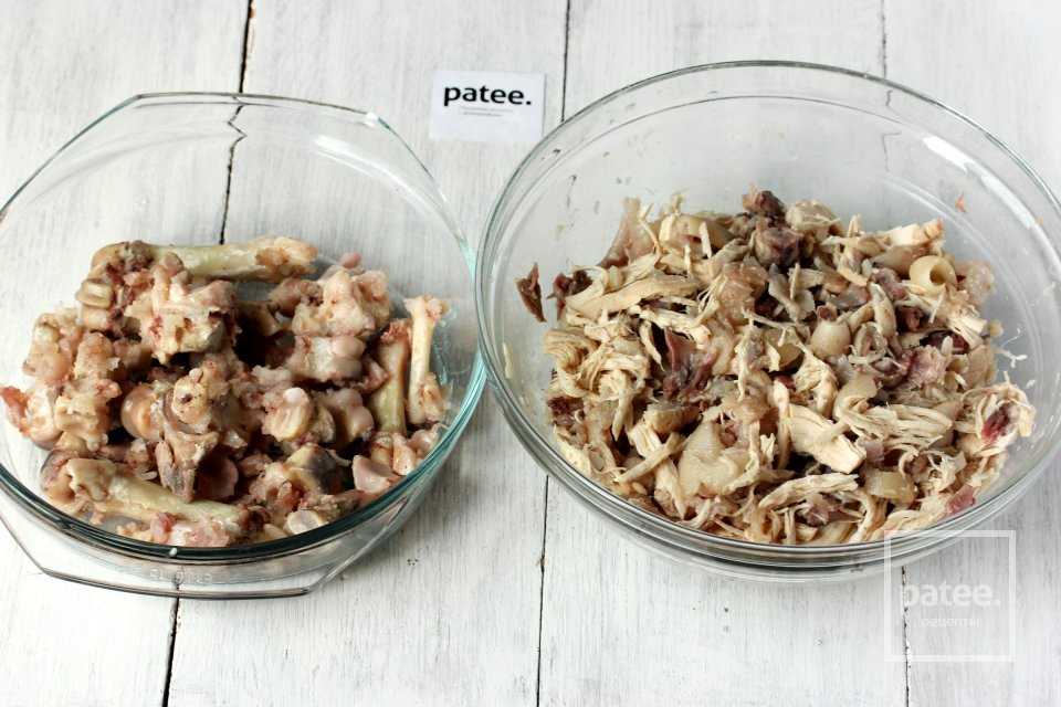 Сваренные лук и морковь нам больше не понадобятся. Кости тщательно извлекаем из ножек. Разделяем куриное мясо на волокна, а мясо и кожу с ножек нарезаем не крупными кусочками.