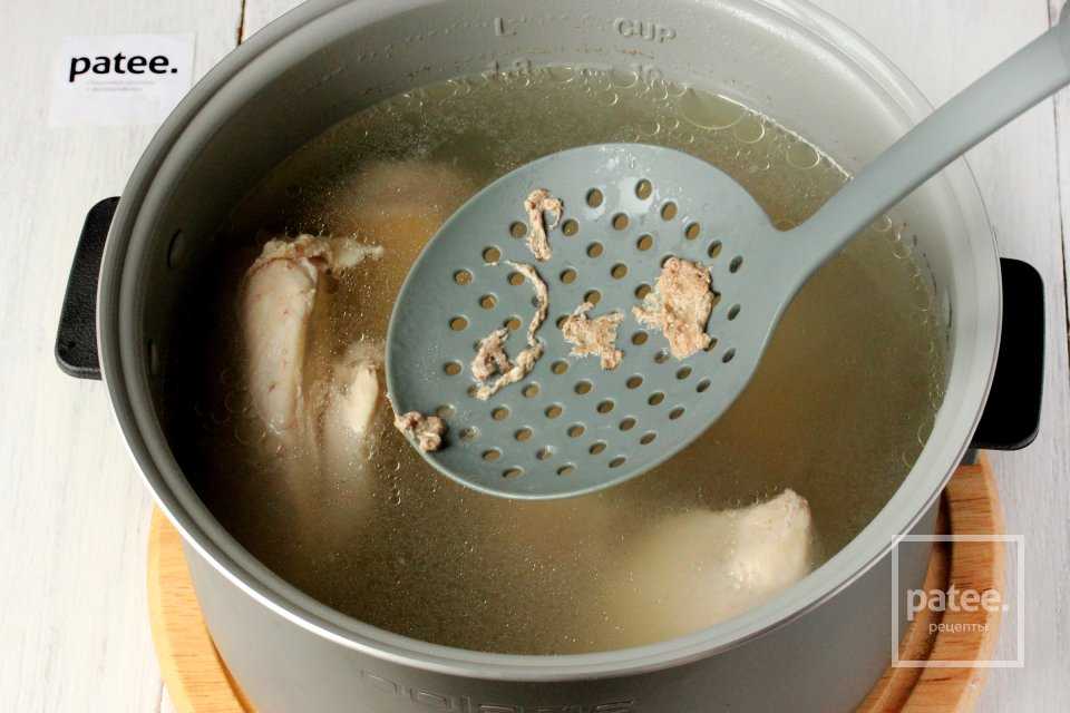 Заливаем всё водой и ставим на огонь. Когда бульон начнёт кипеть, снимаем образовывающуюся пену до чистой воды.