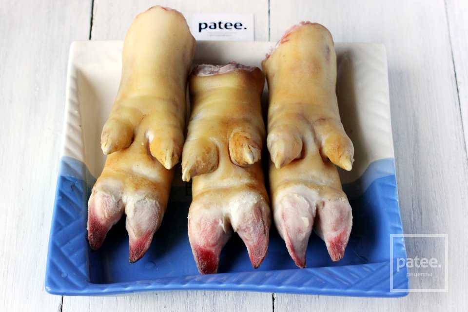 В первую очередь необходимо свиные ножки тщательно очистить от всех загрязнений. В момент покупки ножек попросите продавца снять с них жёсткие пластины, покрывающие копытца. После длительной обработки свиных ножек с помощью маленького острого ножа вы добьётесь того, что ножки станут чистыми, кожа будет однородной, светлого цвета!