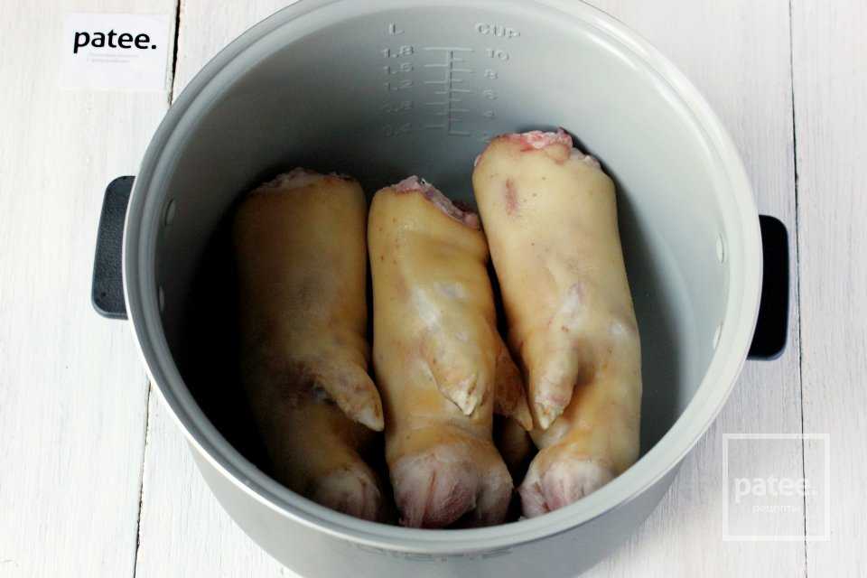Свиные ножки поместить в мультиварку, наполнить чистой водой. Активировать режим для тушения на 2,5 часа.