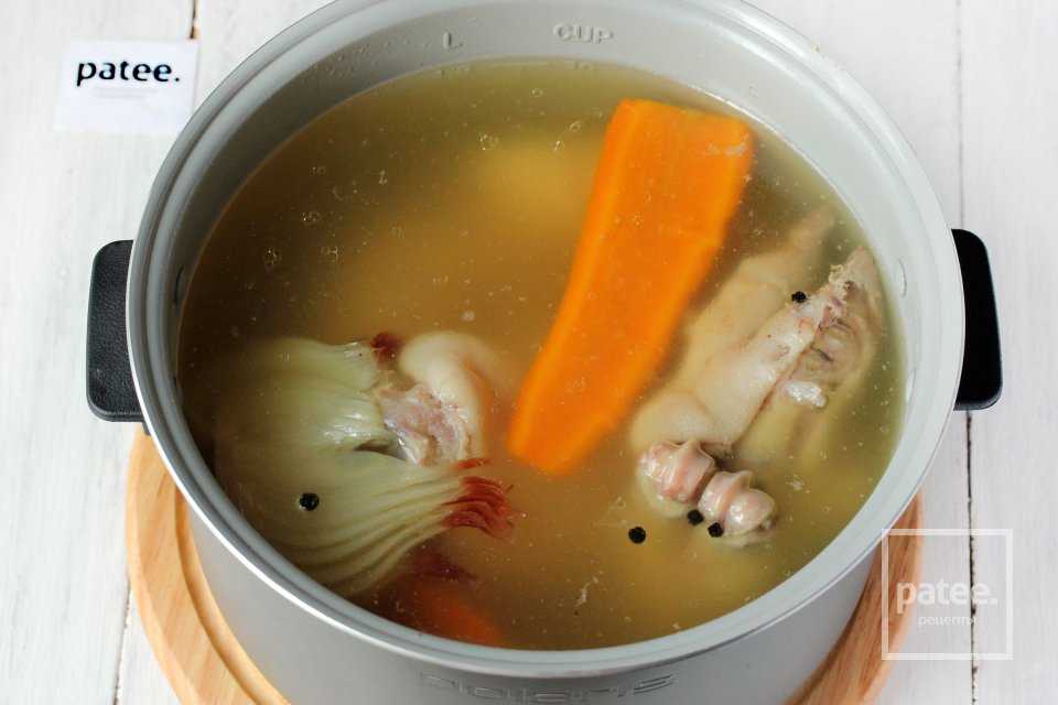 Как только бульон закипит в первый раз, его сливают, мясо промывают и снова заливают чистой водой. Эта процедура позволит сделать холодец прозрачным, а не мутным. После второго закипания с бульона снимают пену, добавляют соль, уменьшают температуру варки до минимума и томят мясо в течение нескольких часов. В процессе варки с поверхности воды периодически удаляют пену и лишний жир.