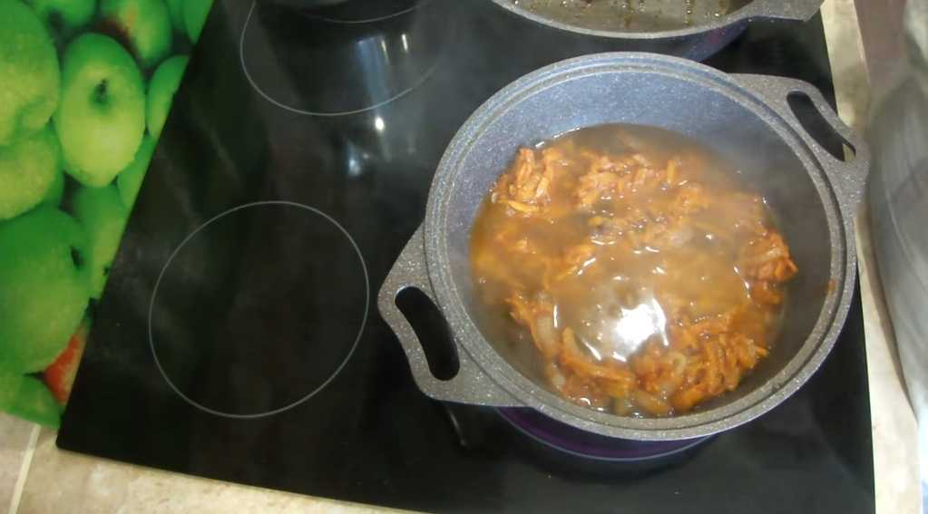 Видите, каким прозрачным стал лук? Приправляем черным молотым перцем и кидаем один-два листика лавра.