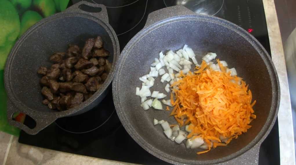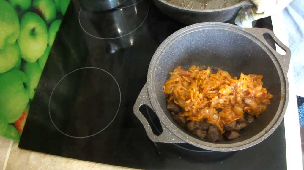 Обжаренное мясо переложите в казан и отставьте. И в этой же сковороде обжарьте лук с морковью.