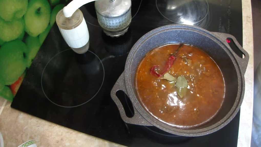 Добавьте в казан горячую кипяченную воду, чтоб мясо скрылось, если вы любите побольше подливы, то и воды добавляйте больше. Убавьте огонь на плите, накройте казан крышкой и тушите до готовности мяса, примерно 1,5 часа.