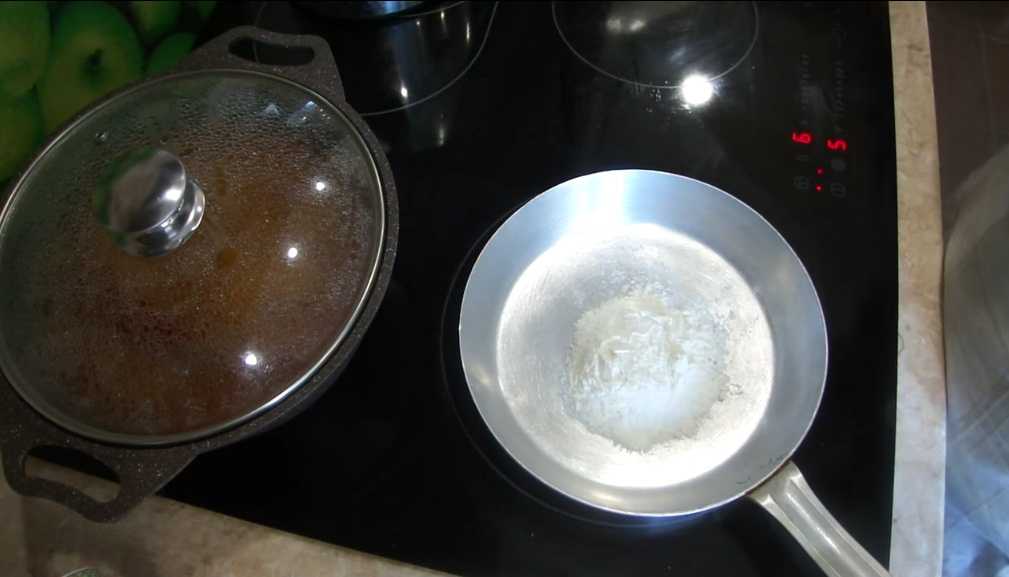 6. Пока специи отдают свои ароматы, займемся мукой. На разогретую сухую сковороду кладем 2-3 столовые ложки пшеничной муки. Перемешивая, обжариваем до легкой золотистости. Не пережарьте, иначе блюдо будет горчить! Сразу же переложим обжаренную муку в отдельную мисочку или тарелку. Добавим теплую воду и тщательно размешаем, чтобы не было комочков.