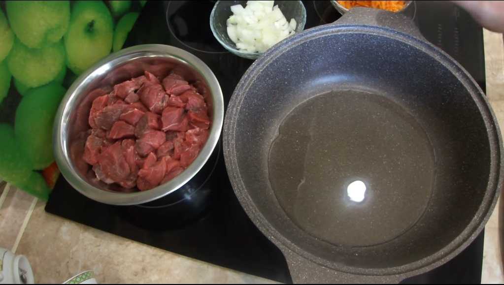 Свинину нарежьте кубиками размером с грецкий орех. Морковь натрите на терке, лук порежьте кубиками. Поставьте глубокую сковороду на плиту, налейте растительное масло и дождитесь полного нагрева.