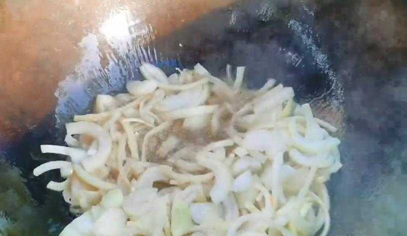 - На раскаленном растительном масле в казане обжарить до желтого цвета лука.