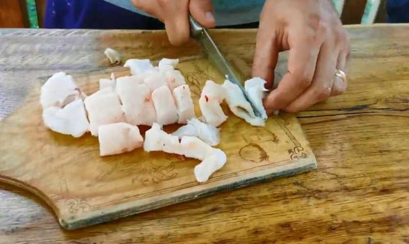 - Пока овощи тушатся, нарезать свинину кубиками.