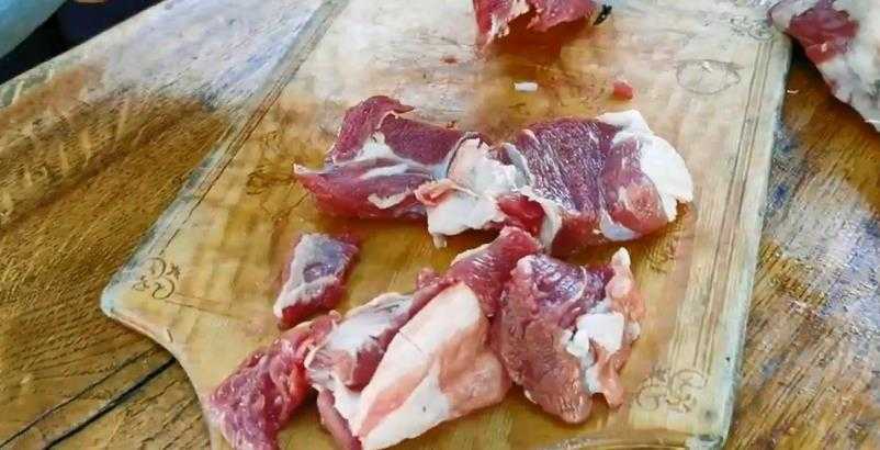 - Баранину промыть, нашинковать небольшими кусочками и отправить ее к поджарке.