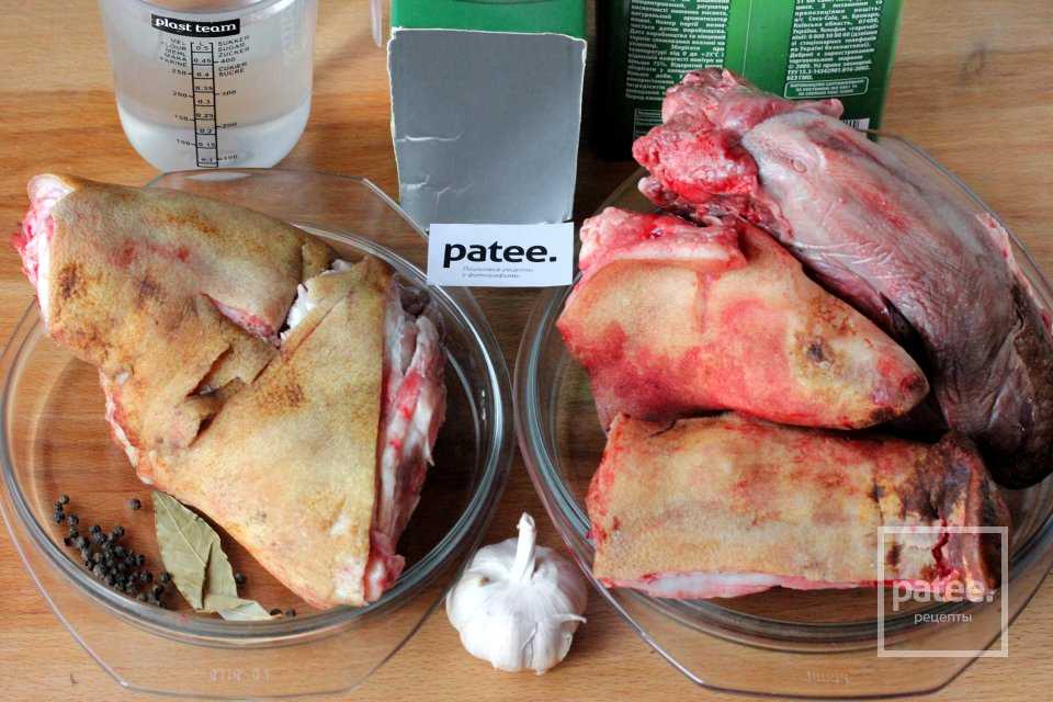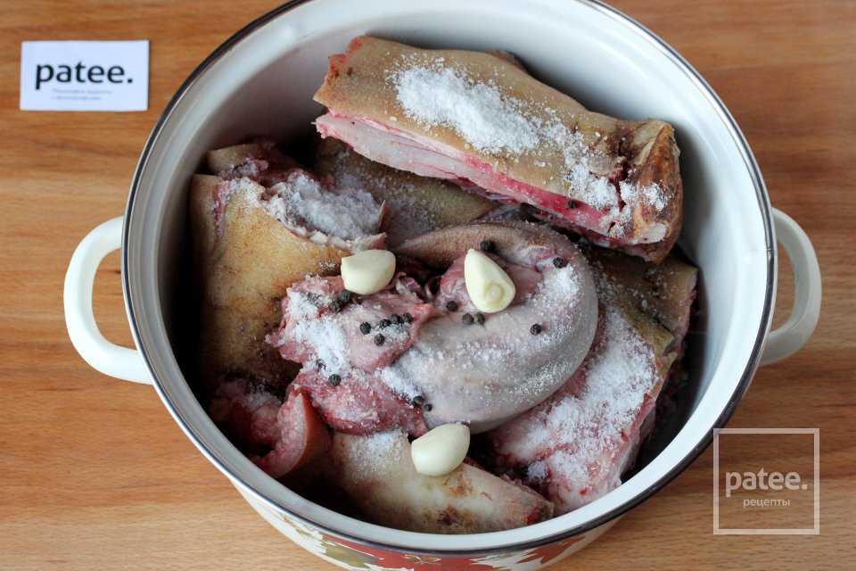 - Почистите субпродукт, промойте, разделите на две части. Залейте водой. Оставьте на пару дней вымачиваться. Если берете магазинные ножки, данную процедуру можно пропустить, речь идет о домашней свинине.