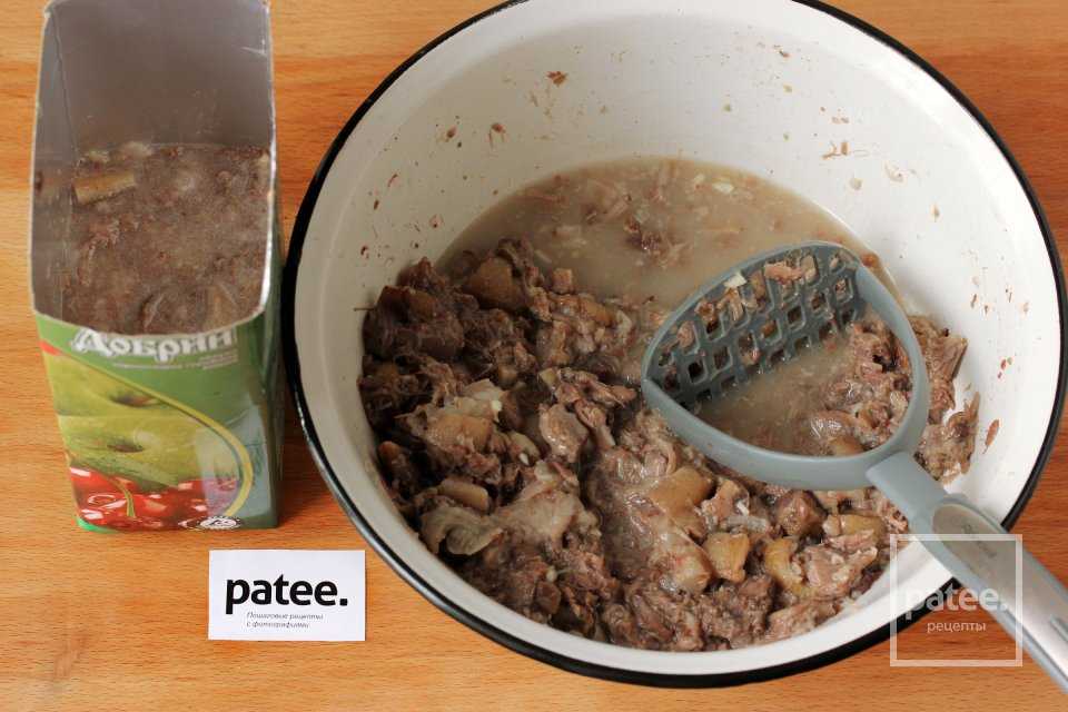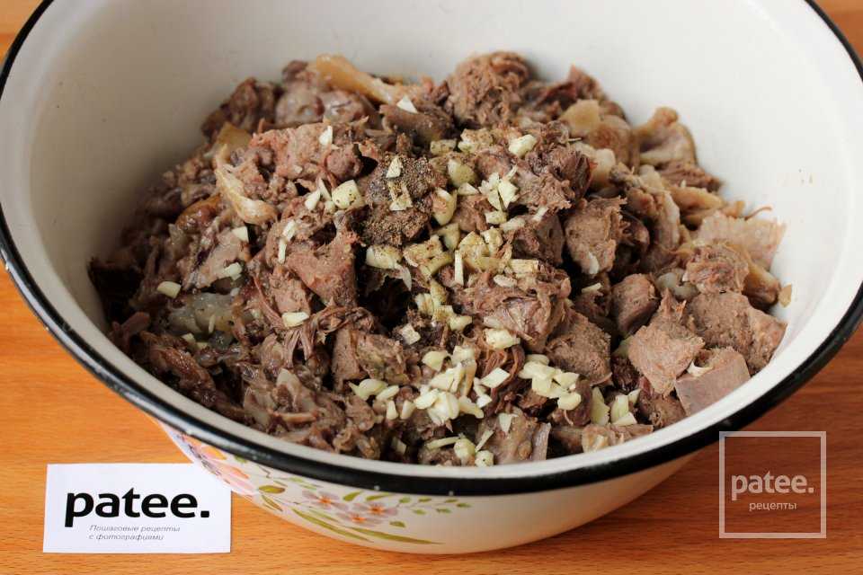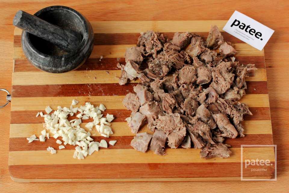 - Мясо извлекаем из бульона, ждем пока оно остынет, удаляем кости и нарезаем мелко. Подкладываем рубленый чеснок, присаливаем и перемешиваем;