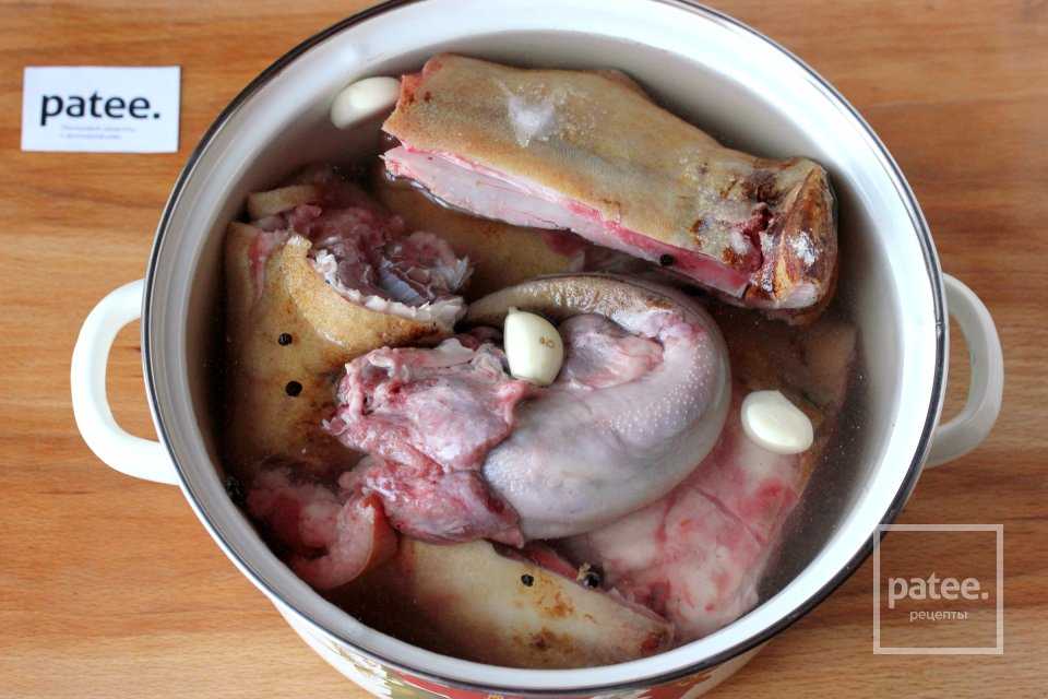 - Далее шаги процесса приготовления напоминают варку холодца. Сложность состоит в том, что необходимо самостоятельно разделать голову на 6 частей. Для этого можно использовать топорик. Но сначала нужно тщательно промыть и поскоблить кожу, обжечь огнем остатки щетины, удалить глаза. Отдельно срезаются уши и тщательно вымываются изнутри;