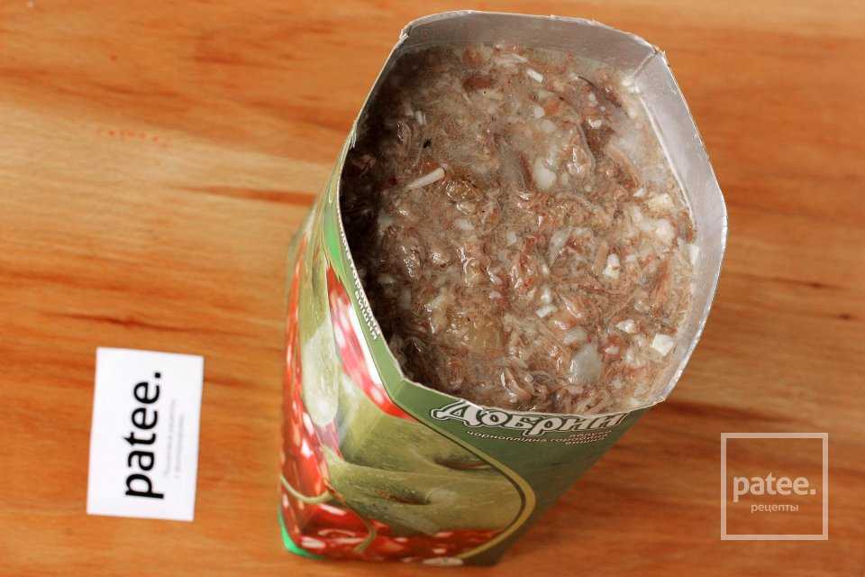 Я не буду повторяться и покажу уже как укладывать начинку в бутылку. Можно взять ее любой формы, даже подойдет тетра-пак от сока. Дно у нее нужно отрезать, а готовое вареное мясо плотно в нее утрамбовать.