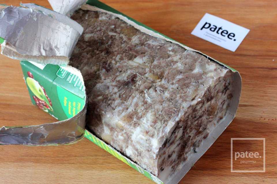 - Готовый сальтисон нельзя сразу же доставать из пакета. Оставляем деликатес в покое на несколько часов, чтобы он полностью охладился. Когда мясная масса хорошенько застынет, берем в руку нож и разрезаем тетрапакет. Сальтисон выглядит очень аппетитно. Не правда ли?