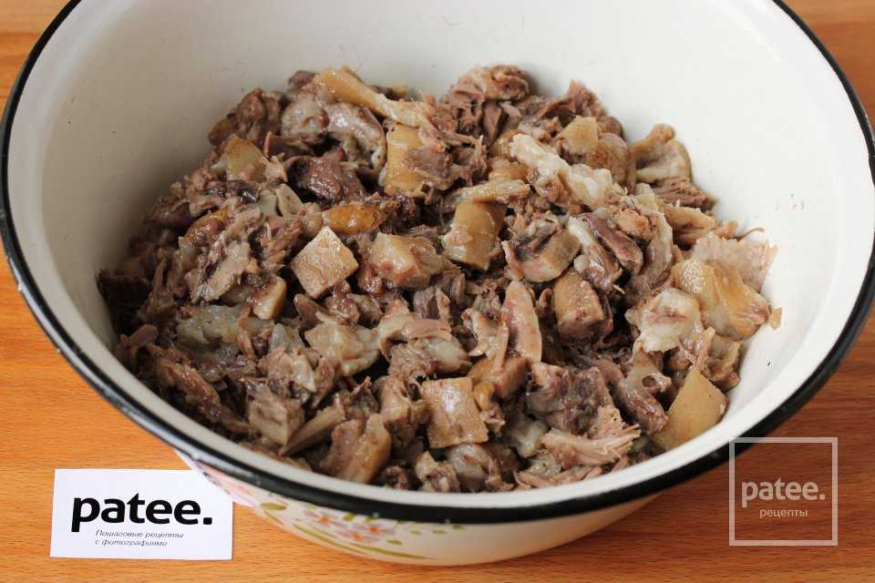 Из сваренного мяса (головы и голеней) удаляем все кости.