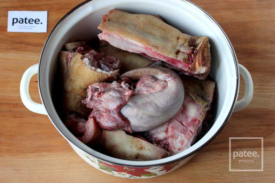 Тщательно промываем и ножом очищаем от загрязнений свиную голову (особенно пятачок, уши), голень и язык. Для удобства большие куски можно разрубить на несколько частей.