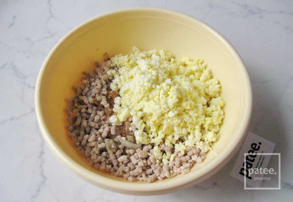 Перемешиваем молотое отварное мясо, жареный лук, вареные яйца, соль и перец. Чтобы начинка не была слишком сухой можно добавить немного мясного бульона или воды.