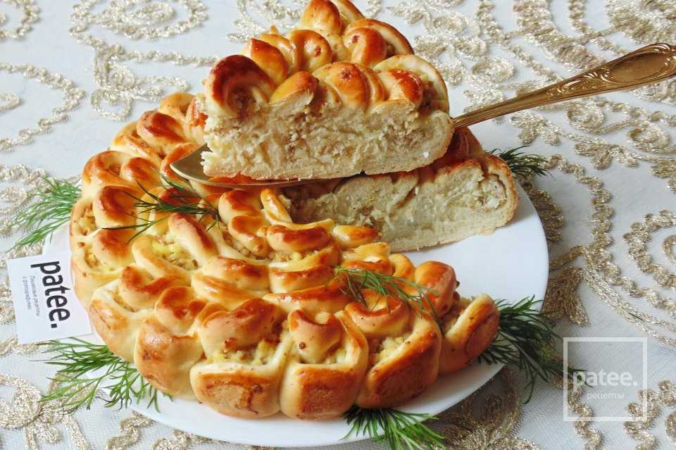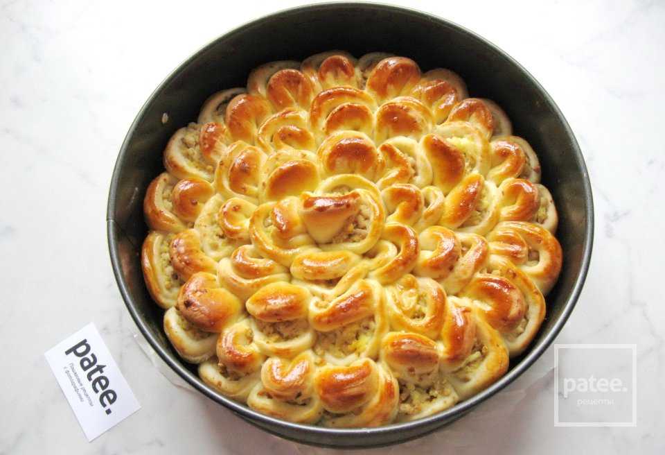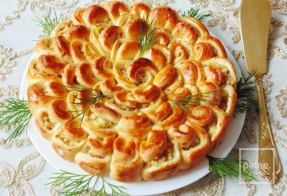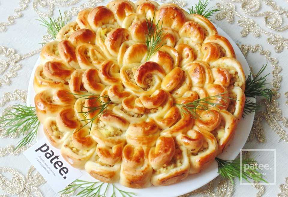 Этот пирог — вкусный, пышный, домашний, приготовлен из обычного дрожжевого теста. Но интересен он прежде всего своей формой, похожей на хризантему. Причем испечь его можно с любой начинкой: фруктовой, ягодной, кремовой или такой, как у меня. Очень вкусно будет с отварной рыбой и рисом, а также капустой, яйцами и грибами. Такой цветок сделать очень просто.