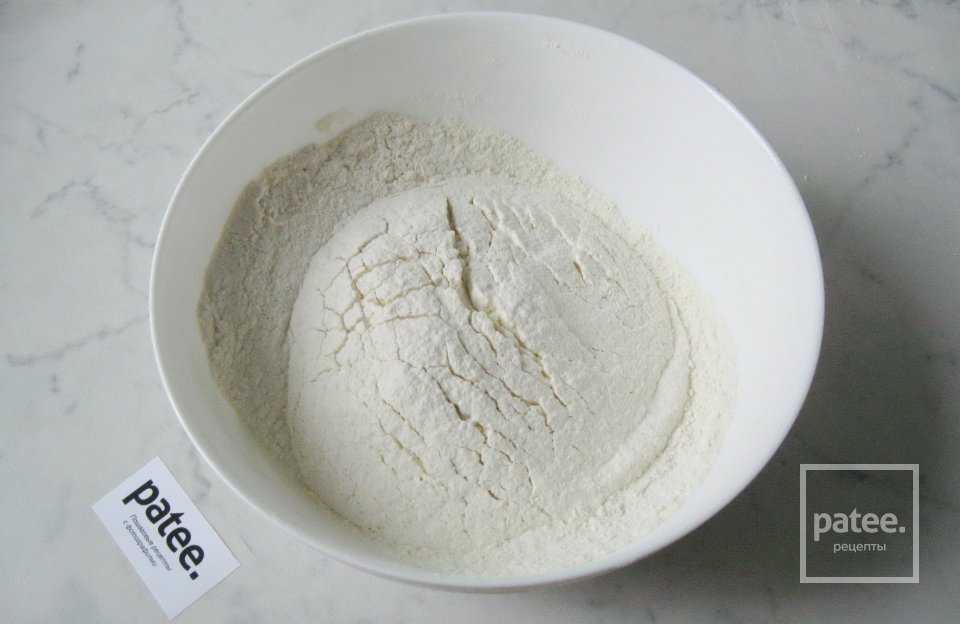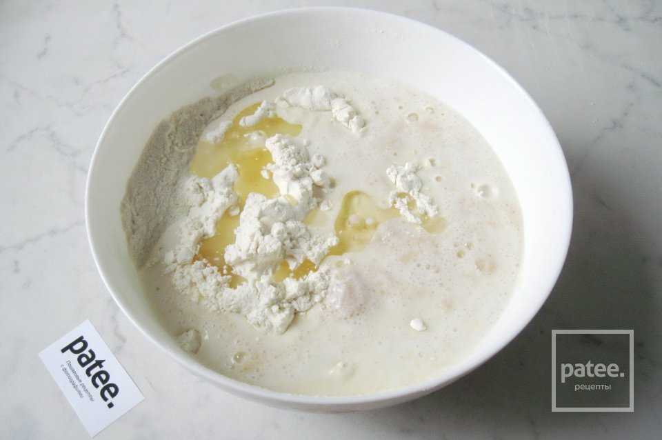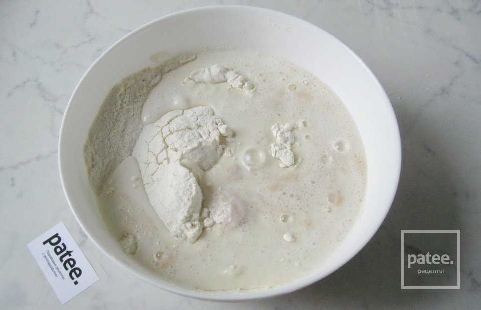 Кладем в просеянную муку соль, смесь кефира, молока, сахара и дрожжей.
