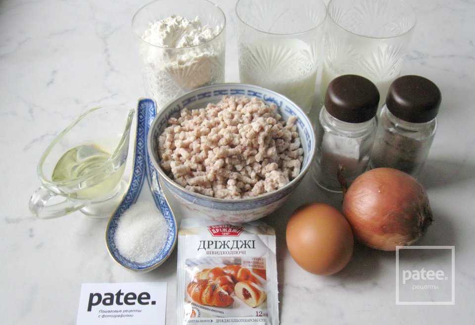 Для приготовления дрожжевого пирога с отварным мясом потребуются следующие ингредиенты: молоко, кефир, сухие дрожжи, сахар, соль, подсолнечное масло, мука, отварное молотое мясо, яйца, перец черный молотый, лук репчатый.