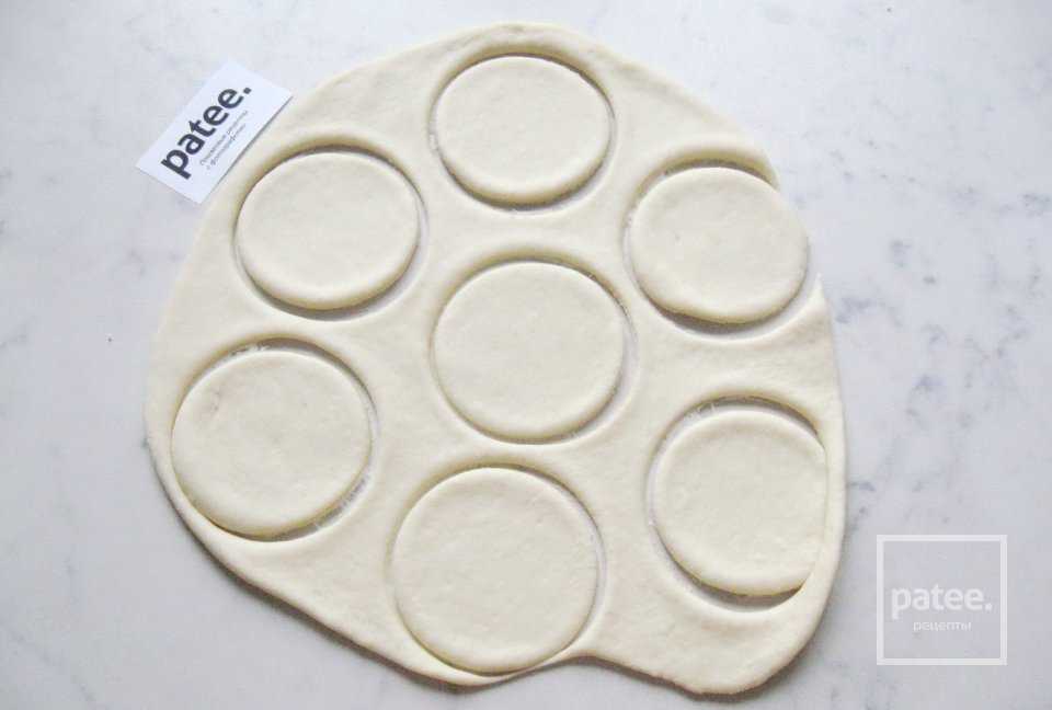 Далее подготовим большие мини-пироги. Это вариант на скорую руку, когда некогда катать отдельные сочни. Из упаковки готового теста получается 8 пирогов.