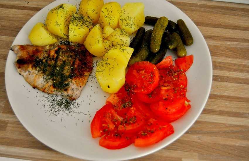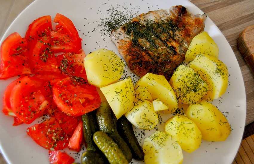 Подавать с вареным картофелем, помидором и малосольными огурчиками.