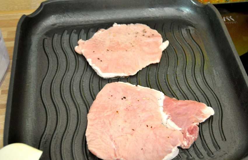 Сковороду-гриль смазать тонким слоем оливкового масла. Выложить отбитые кусочки свинины. Обжарьте с обеих сторон до коричневого цвета и характерными полосками от борозд сковороды-гриль.