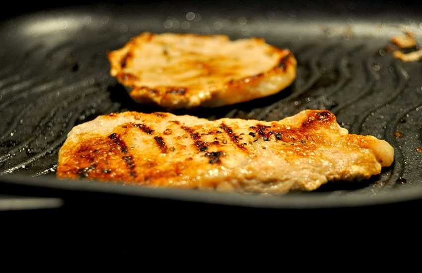 - Сковороду-гриль разогревают до средних температур, после чего выкладывают на нее свинину. Стейки прожаривают от 3 до 5 минут с каждой стороны до появления золотистой и румяной корочки. Использование соевого масла в качестве маринада ускоряет этот процесс.