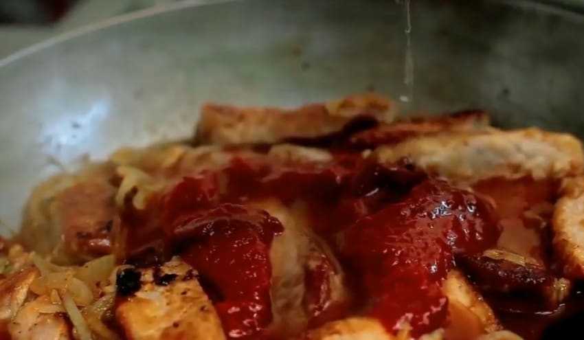 3. Чеснок раздавите, вмешайте его в томатный соус и влейте эту смесь в сковороду с мясом. Потом влейте немного воды и тушите 15 минут на умеренном огне.