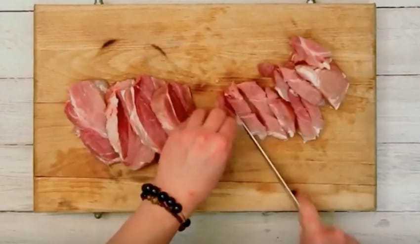 1. Удаляем с мяса все пленки и сухожилия. Нарезаем свинину поперек волокон, кусочками по 2 сантиметра толщиной. Слегка отбиваем.