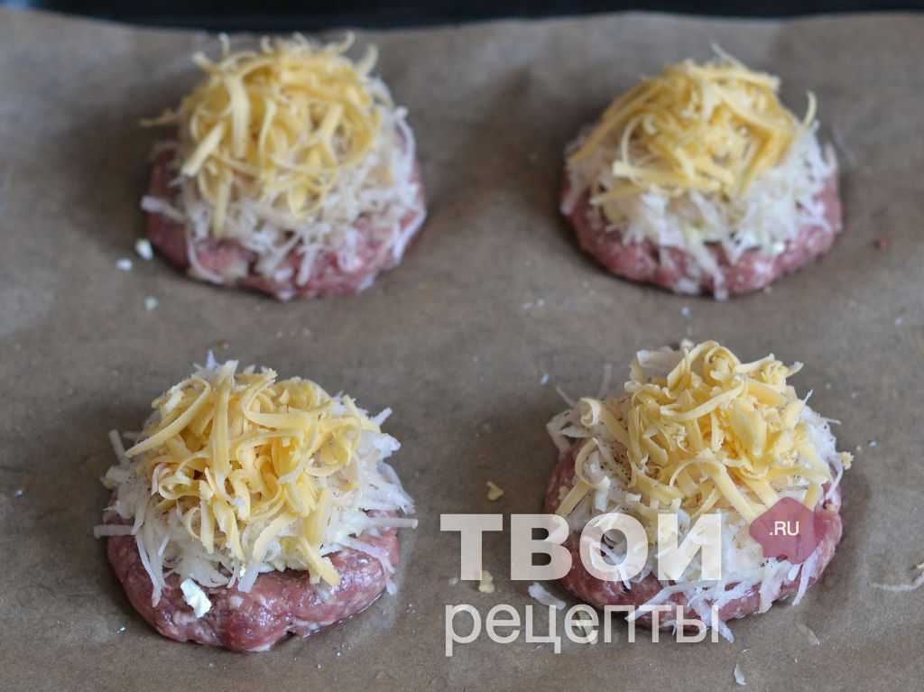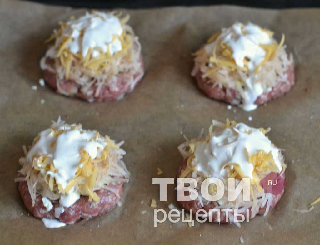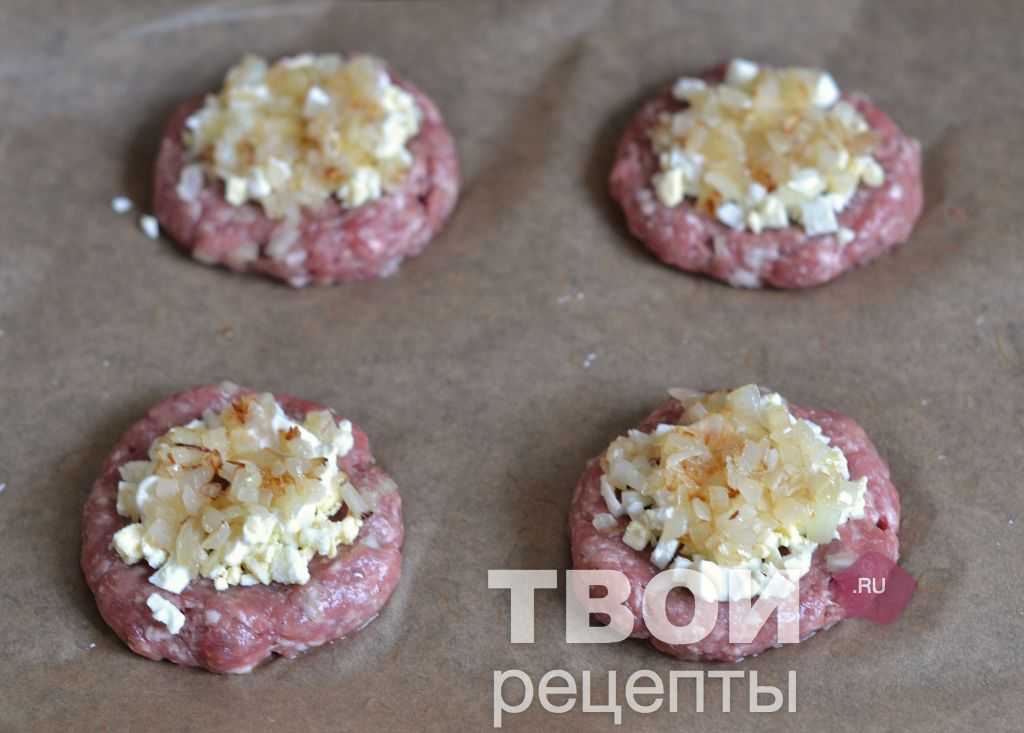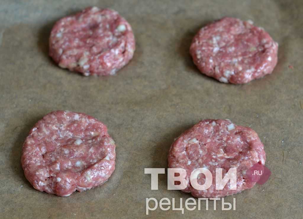 Противень застелить бумагой для выпечки, смазать растительным маслом. Сформировать из фарша лепешки