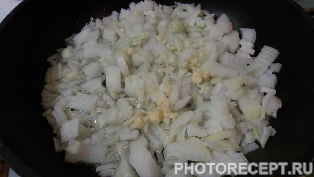 Чистим и режем мелкими кусочками лук и чеснок. Обжариваем на сковороде до золотистого цвета, добавив немного масла.