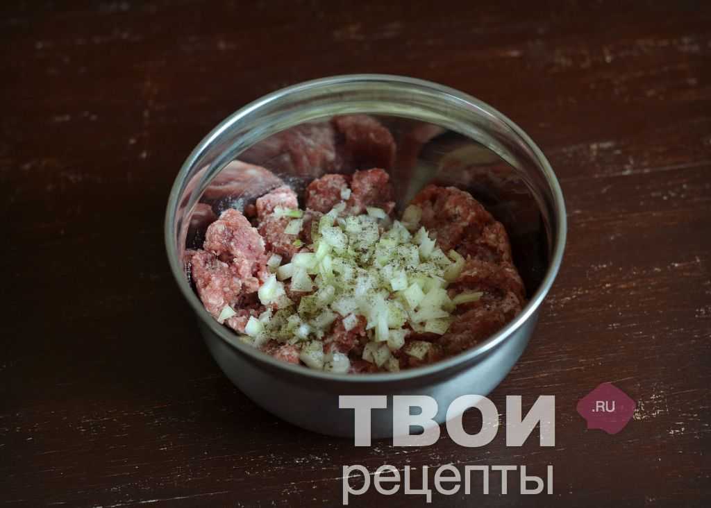 Лук мелко порезать. Половину добавить в фарш, приправить солью и перцем. Остальной лук пожарить на растительном масле до золотистого цвета