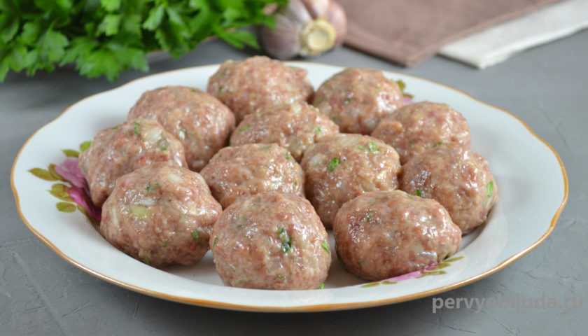 - Из готового фарша слепите тефтели размером чуть больше грецкого ореха, выложите их на плоской тарелке и отставьте на время в сторону.