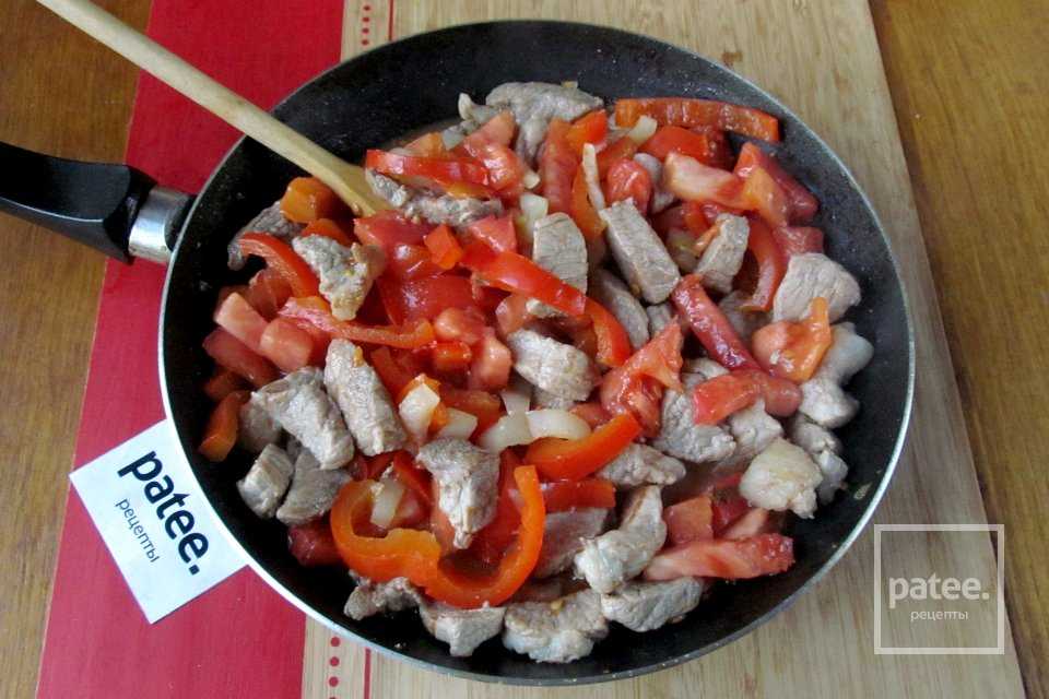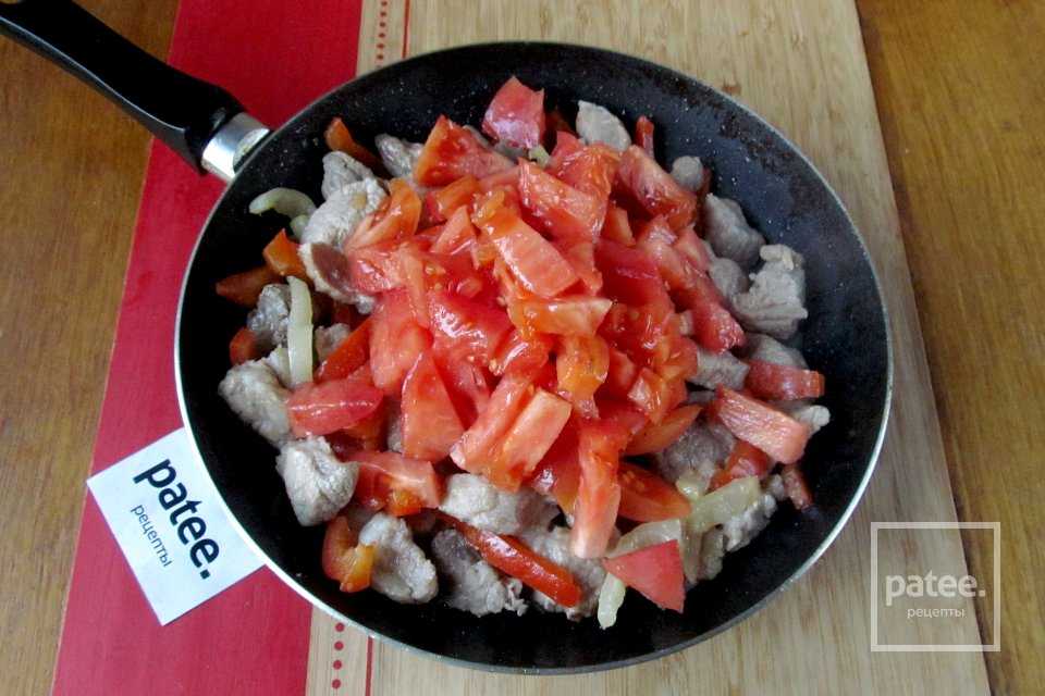 Затем в сковороду к мясу с болгарским перцем добавляем нарезанные помидоры.