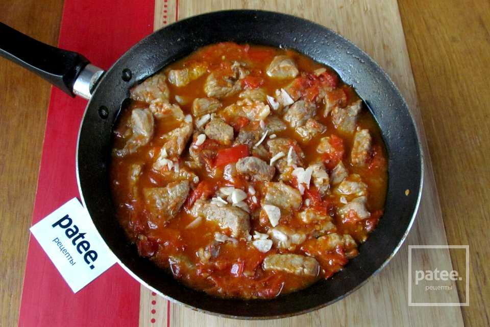 Когда мясо будет готово, добавляем в него измельчённый чеснок и всыпаем чёрный молотый перец. Всё перемешиваем, прогреваем пару минут и снимаем сковороду с плиты.