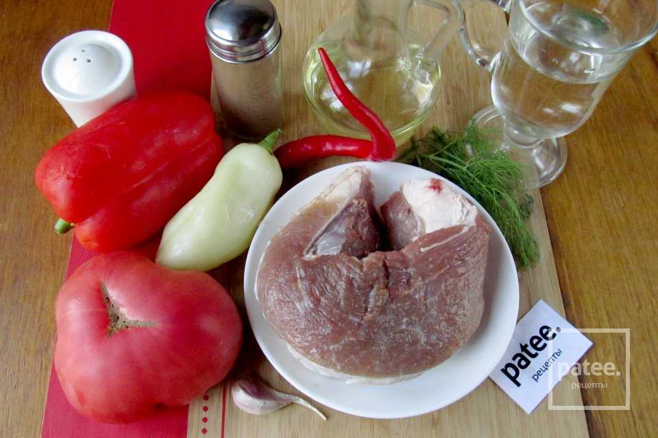 Для приготовления свинины с перцем и помидорами нам понадобятся следующие ингредиенты: мякоть свинины, болгарский перец, помидоры, масло подсолнечное рафинированное, вода, чеснок, острый перец, соль, чёрный молотый перец, укроп.