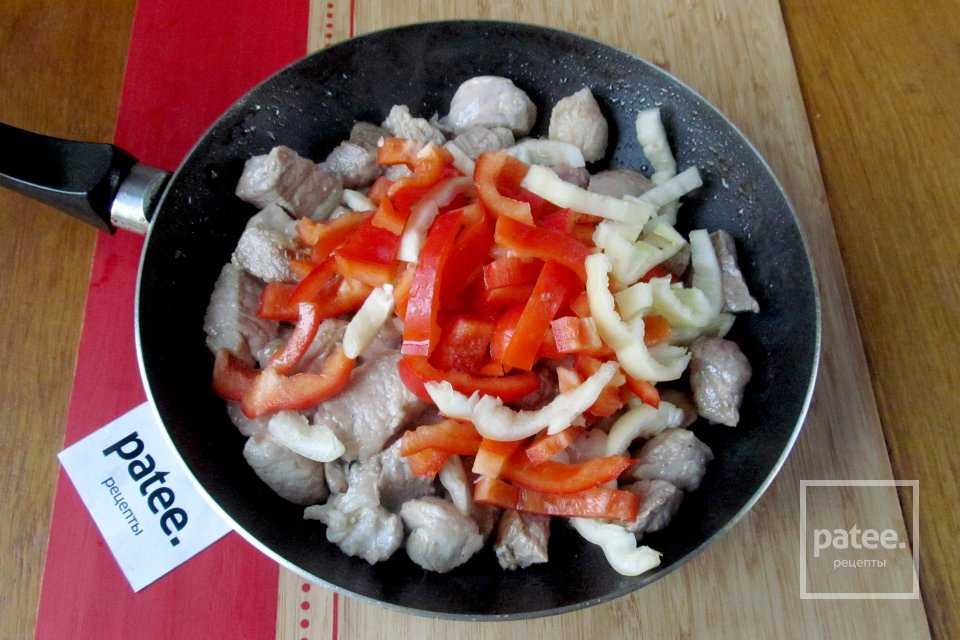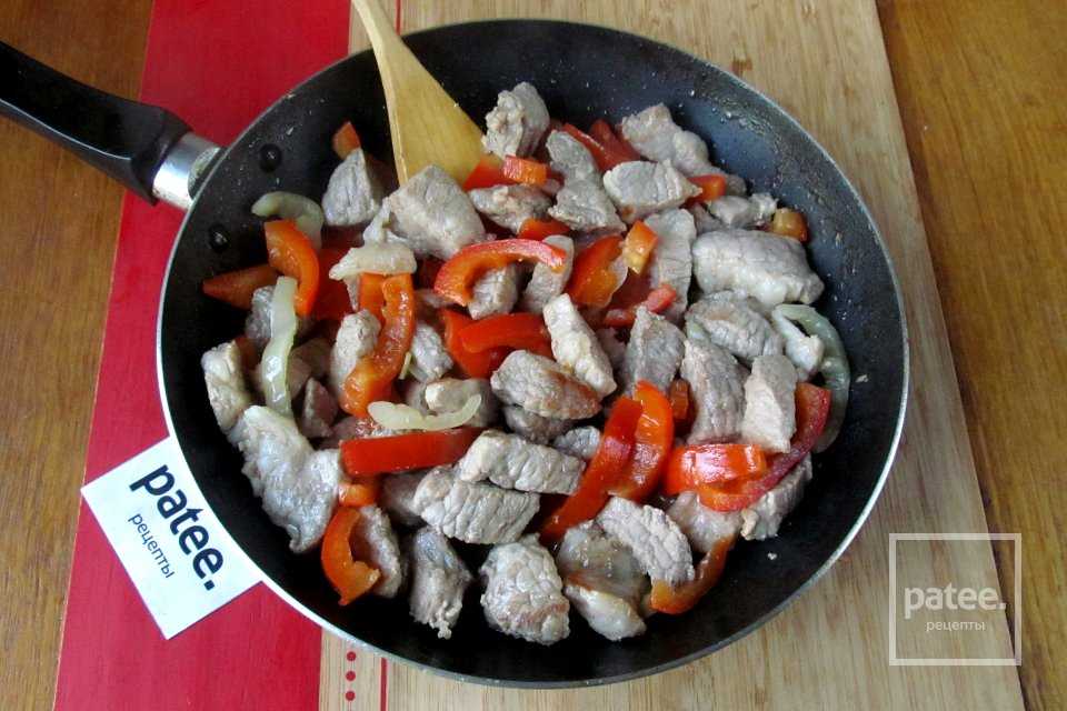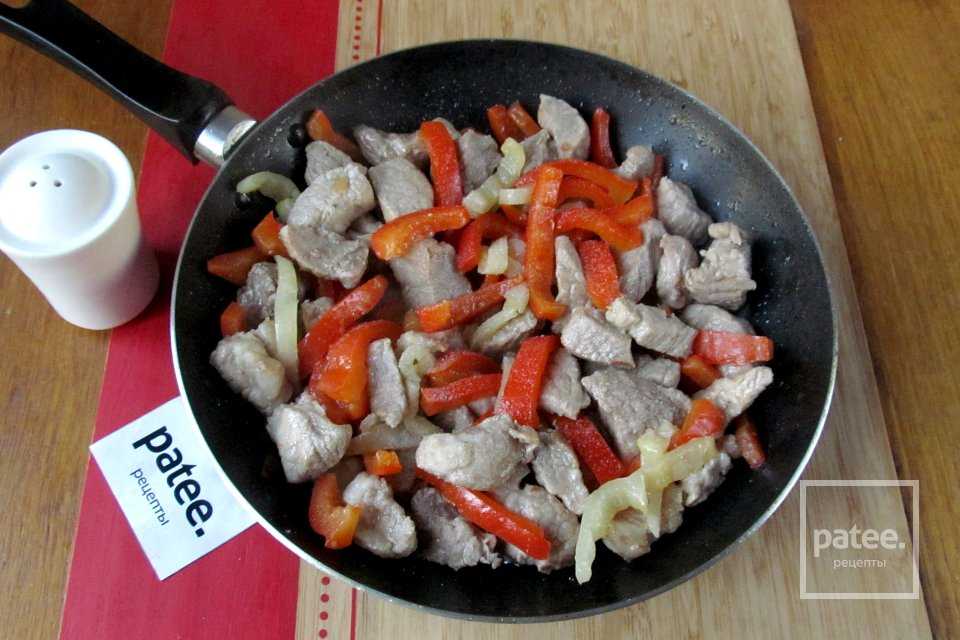 Продолжаем обжаривать свинину с перцем на сильном огне, часто помешивая при этом.