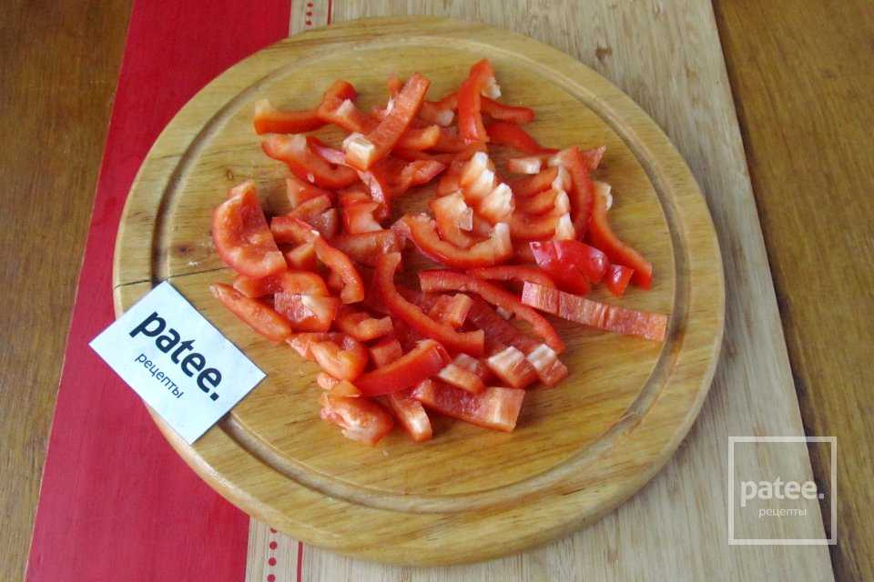 Пока мясо обжаривается, подготовим овощи. Сладкий красный перец моем, вырезаем внутренние перегородки с семенами, а мякоть перца нарезаем соломкой.