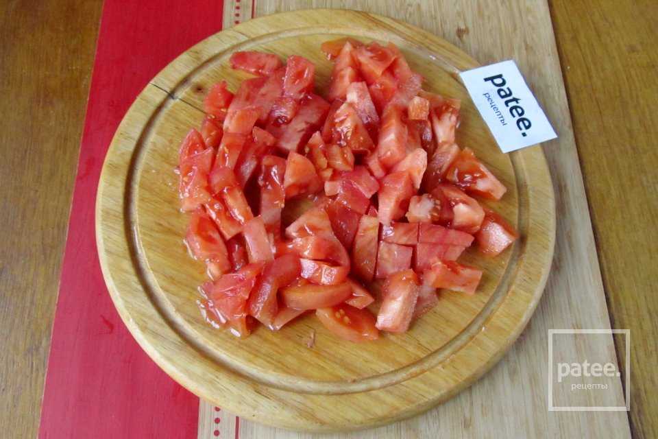 - Томаты помыть, ополоснуть и порезать на кубики.