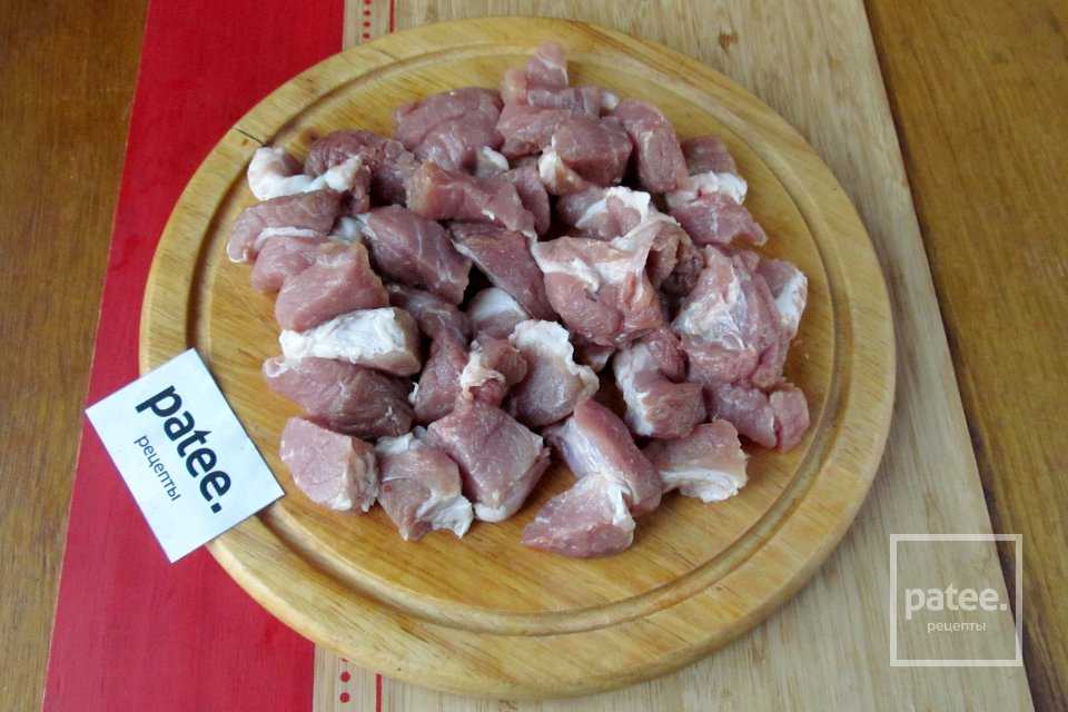 2. Теперь режем на небольшие кусочки свинину и также складываем в форму. Какую ее часть брать смотрите сами, в нашем случае это обычная мякоть.