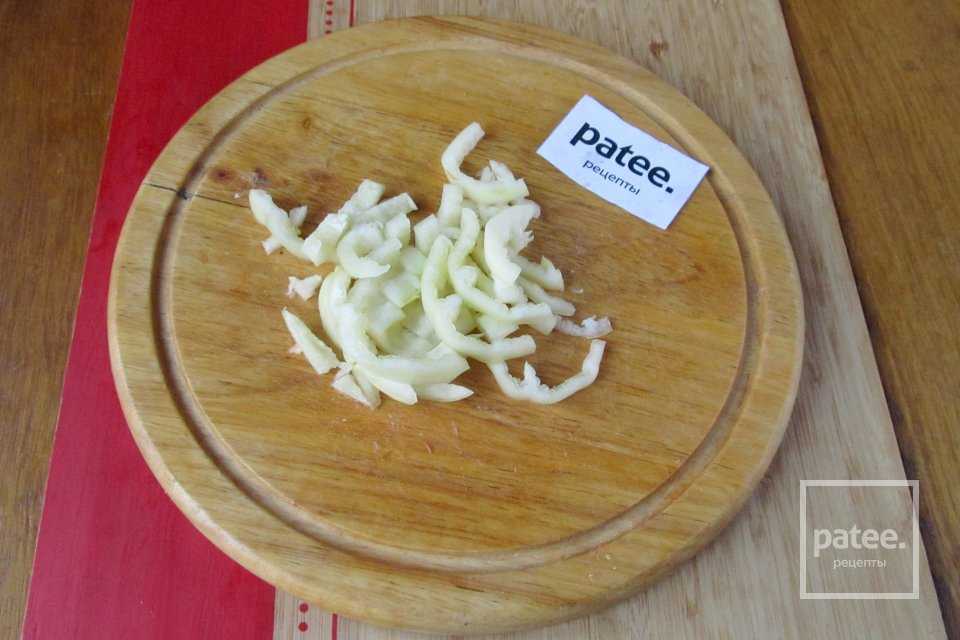 Также нарезаем и жёлтый болгарский перец. При желании можно использовать перец одного цвета или, напротив, к жёлтому и красному добавить зелёный и оранжевый.