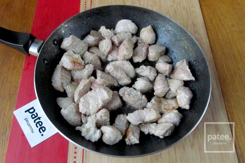 1. Свинину помоем, обсушим салфеткой и нарежем на полоски поперек волокон. Все кусочки хорошо отбить молоточком. Отбитое мясо режем на квадратики. Подготовленные куски свинины обжариваем на растительном масле, пока они не подрумянятся.