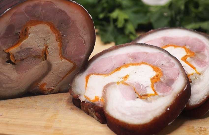 Благодаря особому способу и сочетанию двух видов мяса, блюдо получается невероятно нежным, буквально тающим. Нарезка и бутерброды из такой рульки обладают нежным и пряным ароматом, сочным, насыщенным вкусом.